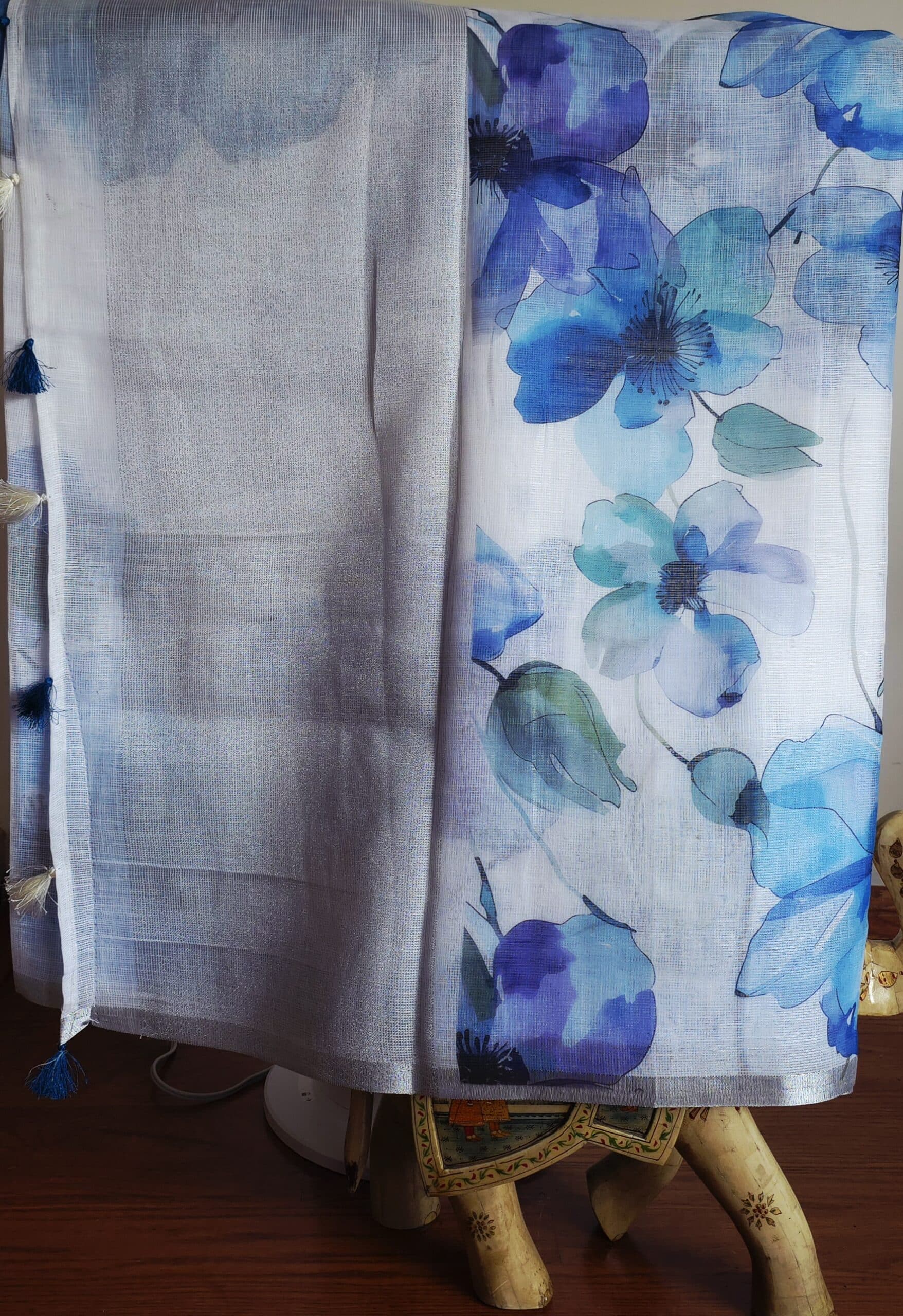 This elegant linen saree features a crisp white base adorned with soft, watercolor-style floral prints in shades of blue and teal. The airy linen fabric gives it a light, breathable feel, making it perfect for warm weather and effortless everyday elegance. Delicate tassel detailing along the edge adds a subtle handcrafted touch.