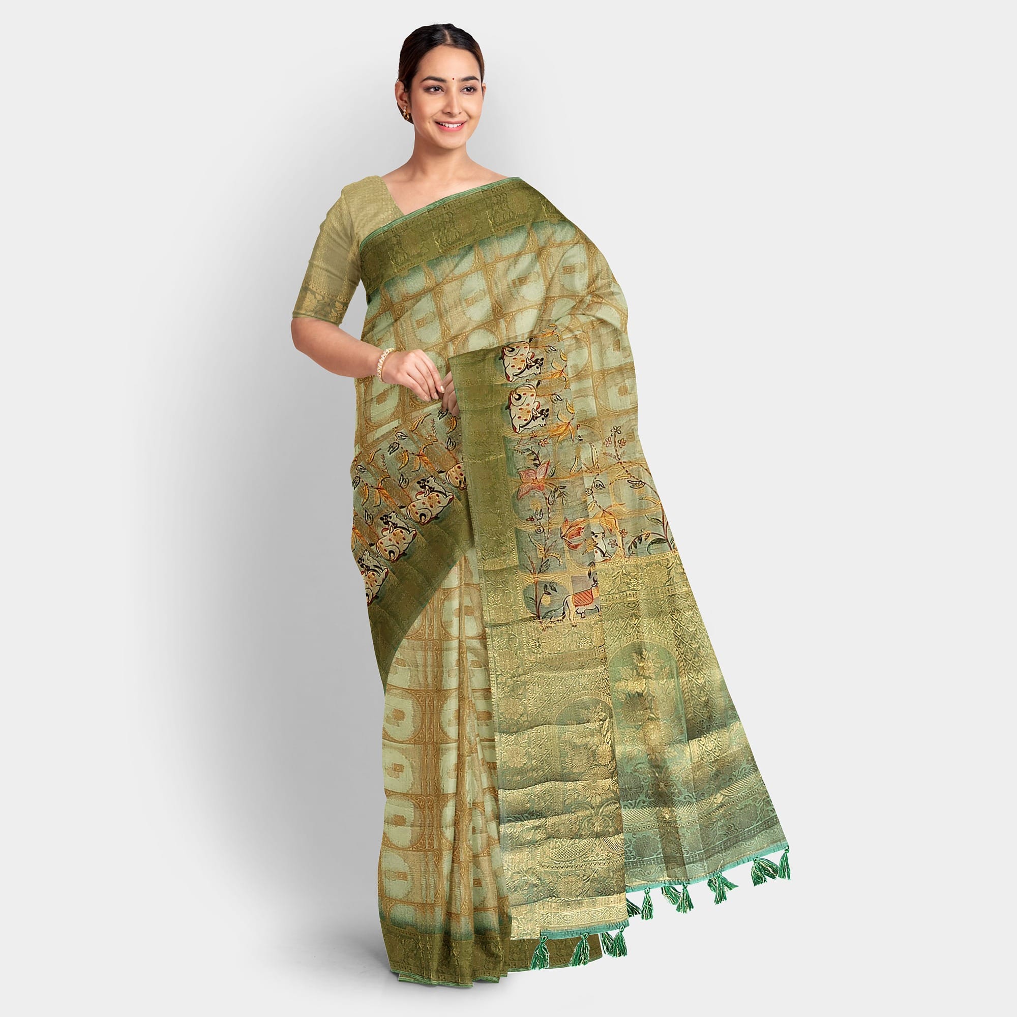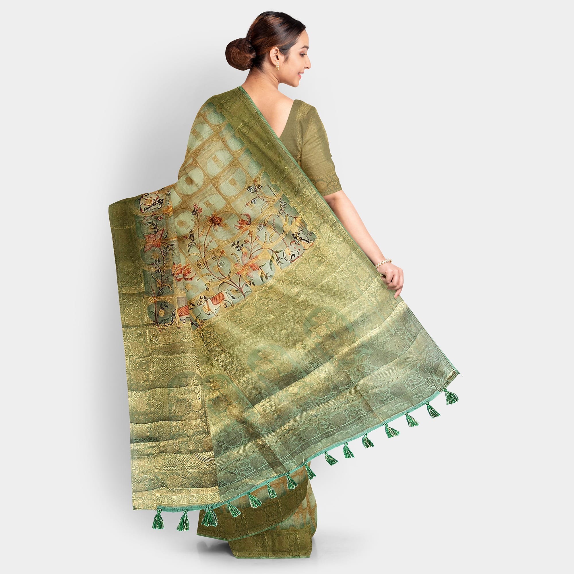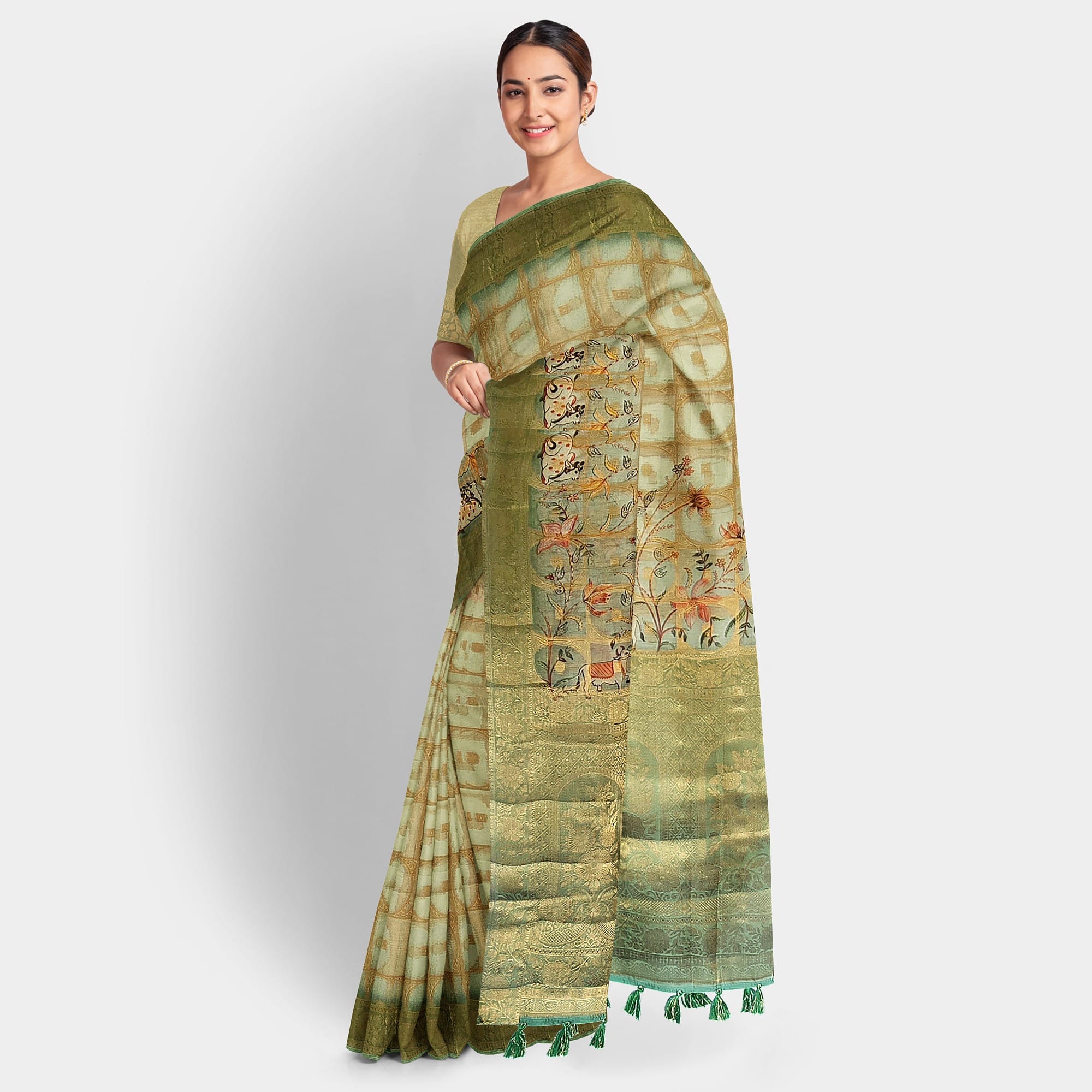 Step into grace with our stunning Green-Cow Organza Saree, a perfect blend of traditional elegance and modern sophistication. Crafted from luxurious organza fabric, this saree offers a lightweight yet structured drape that flows effortlessly, giving you a timeless look for any occasion. The delicate green hue, inspired by the calming shades of nature, adds a unique charm, while the subtle sheen of organza elevates its appeal. Ideal for festive events, weddings, or casual wear, this saree embodies a graceful, airy feel that complements any silhouette.