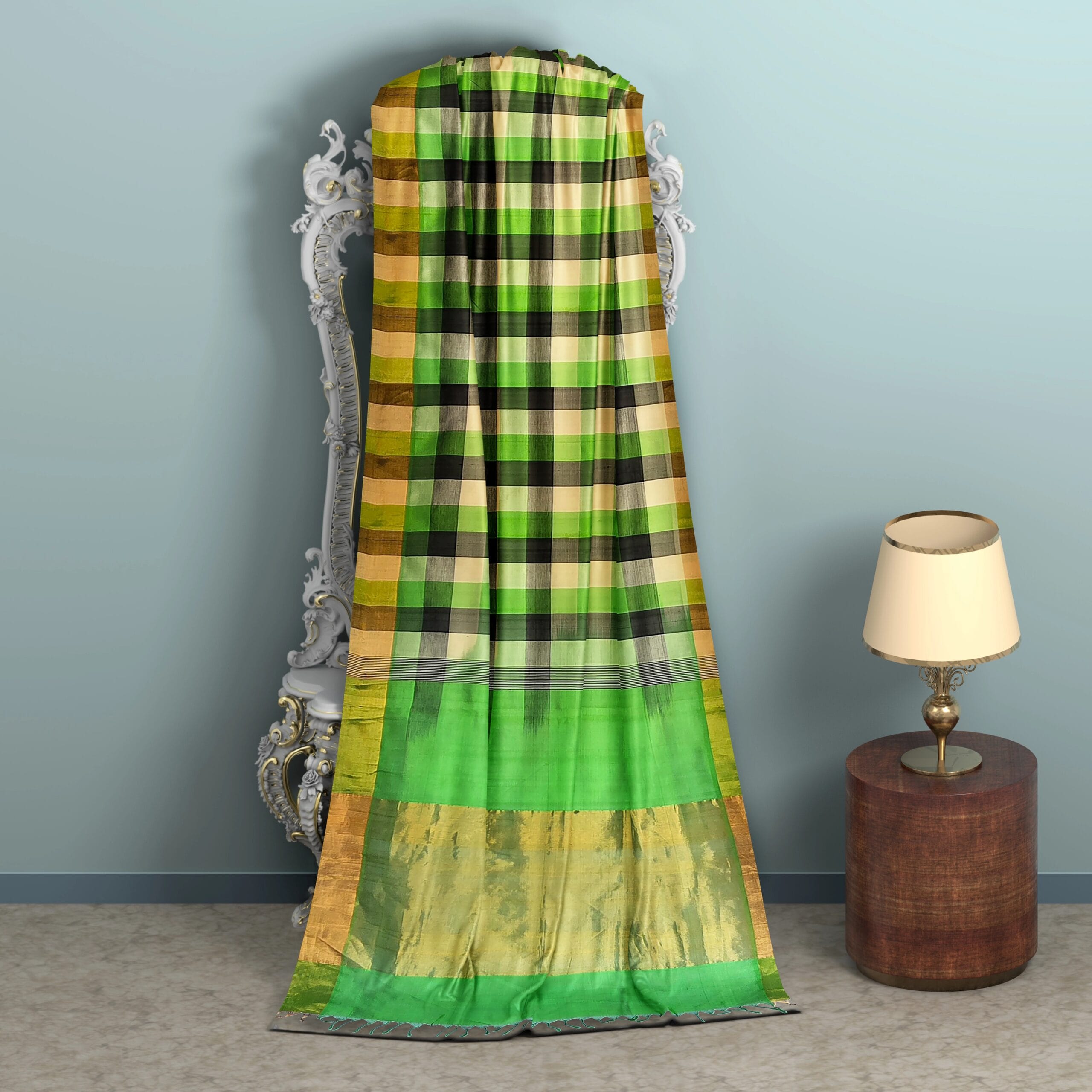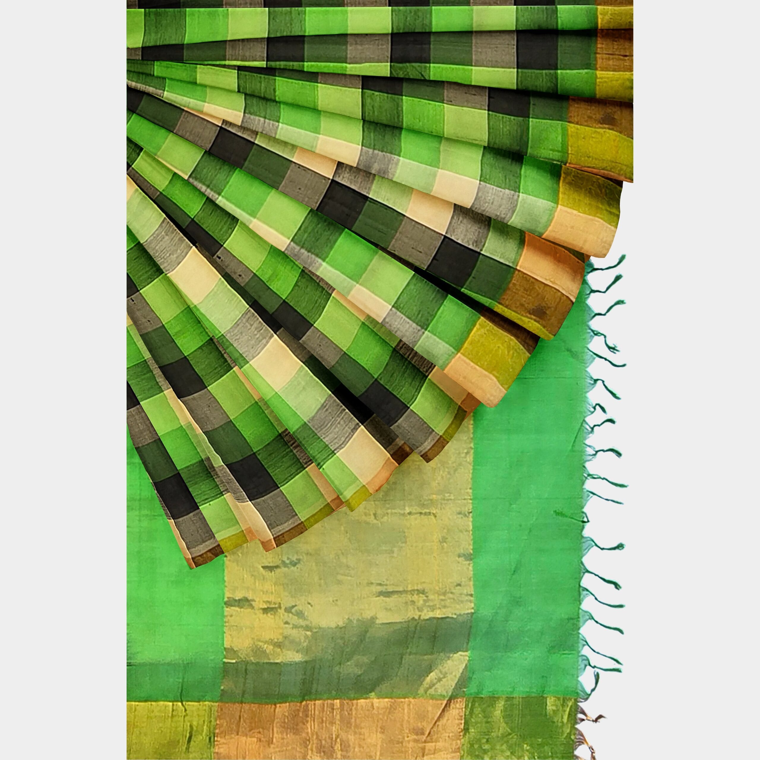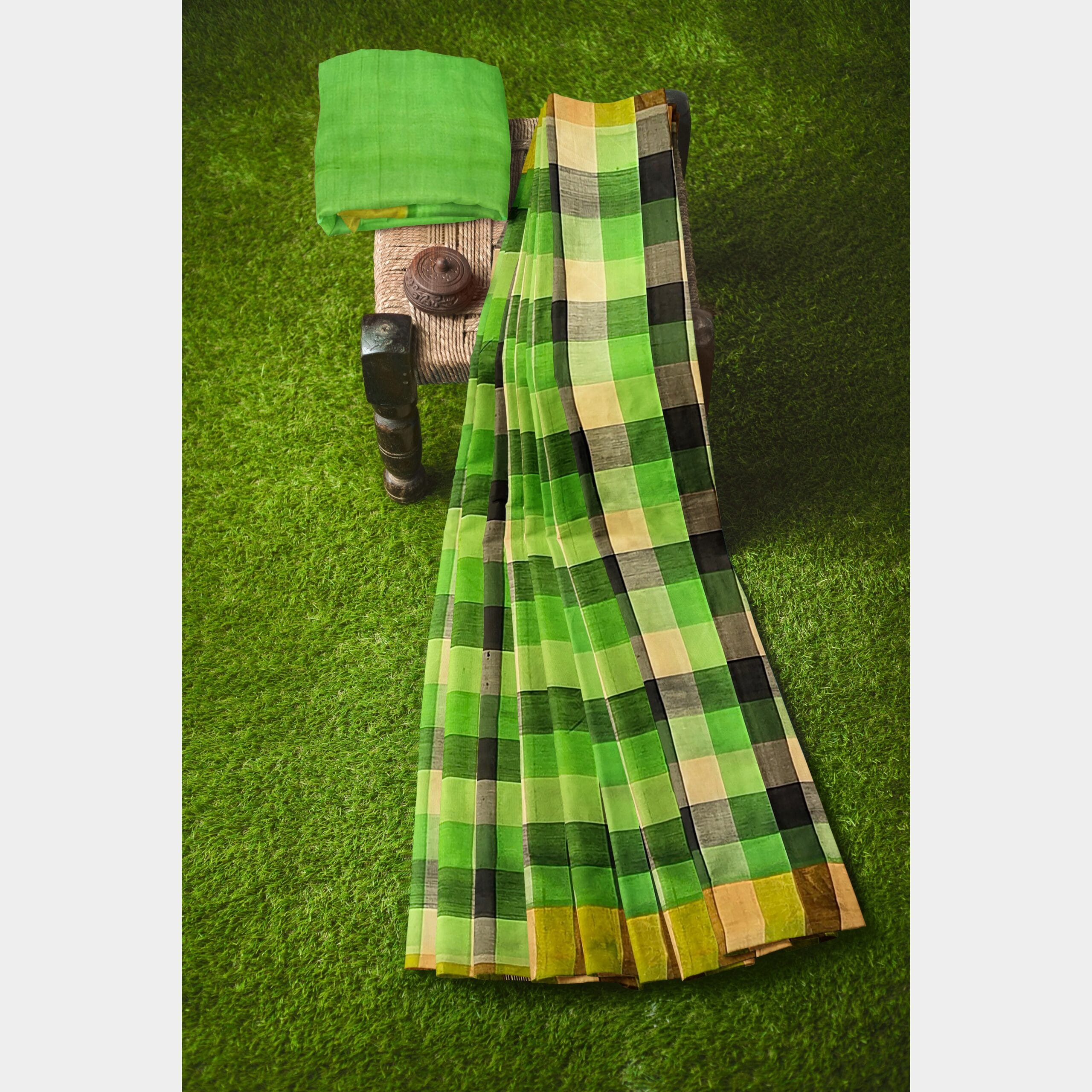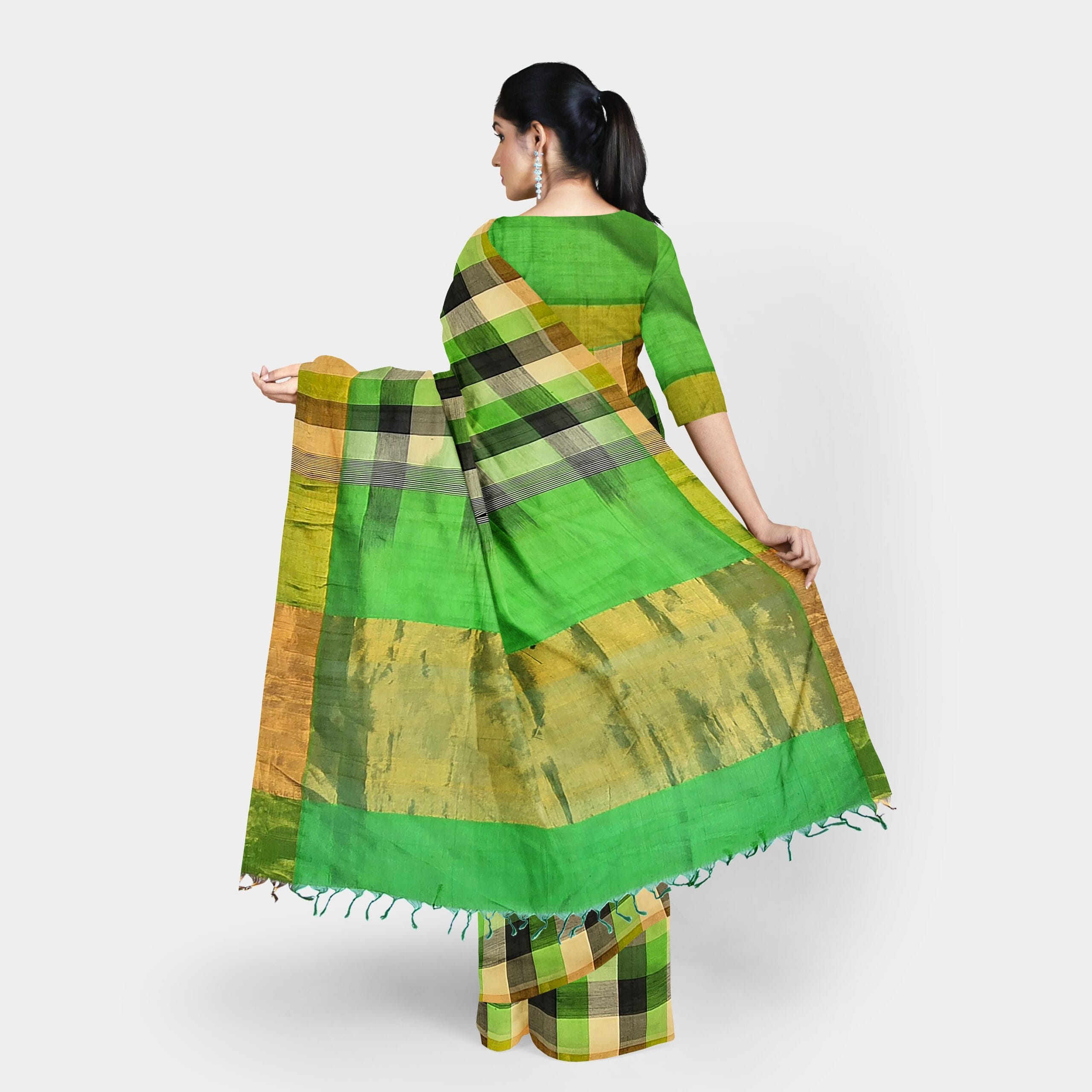 This exquisite Silk Cotton saree is a perfect blend of elegance and tradition. The rich fabric combines the luxurious sheen of silk with the light, breathable comfort of cotton, making it ideal for any occasion. The saree features a vibrant green body, beautifully contrasted with a bold black border that exudes sophistication. Delicate gold zari work embellishes the border and pallu, adding a touch of regal charm. Whether for a festive event or a formal gathering, this saree strikes the perfect balance between opulence and comfort, making it a versatile addition to any wardrobe.