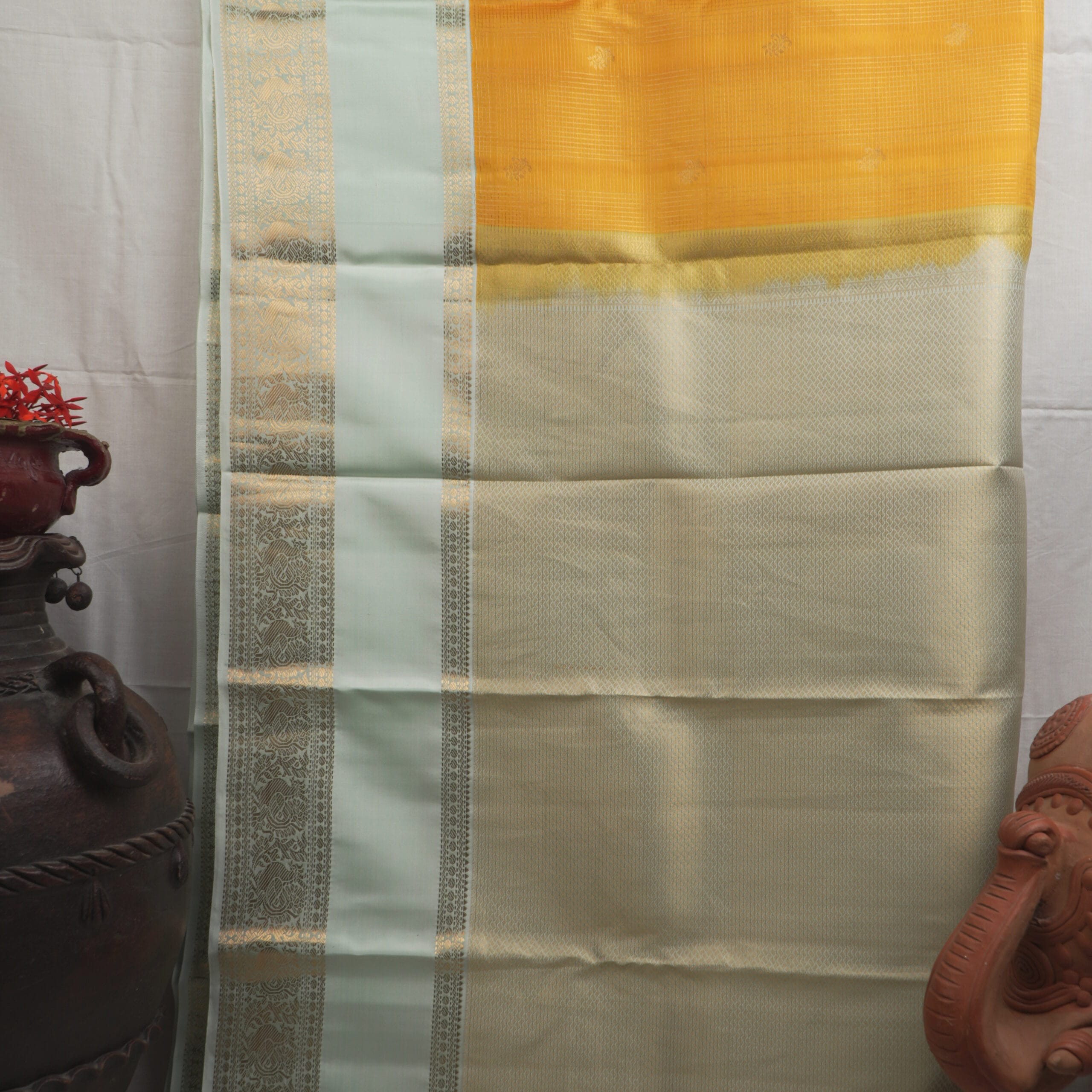Kanchipuram Silk – Mustard Yellow with Ivory Border