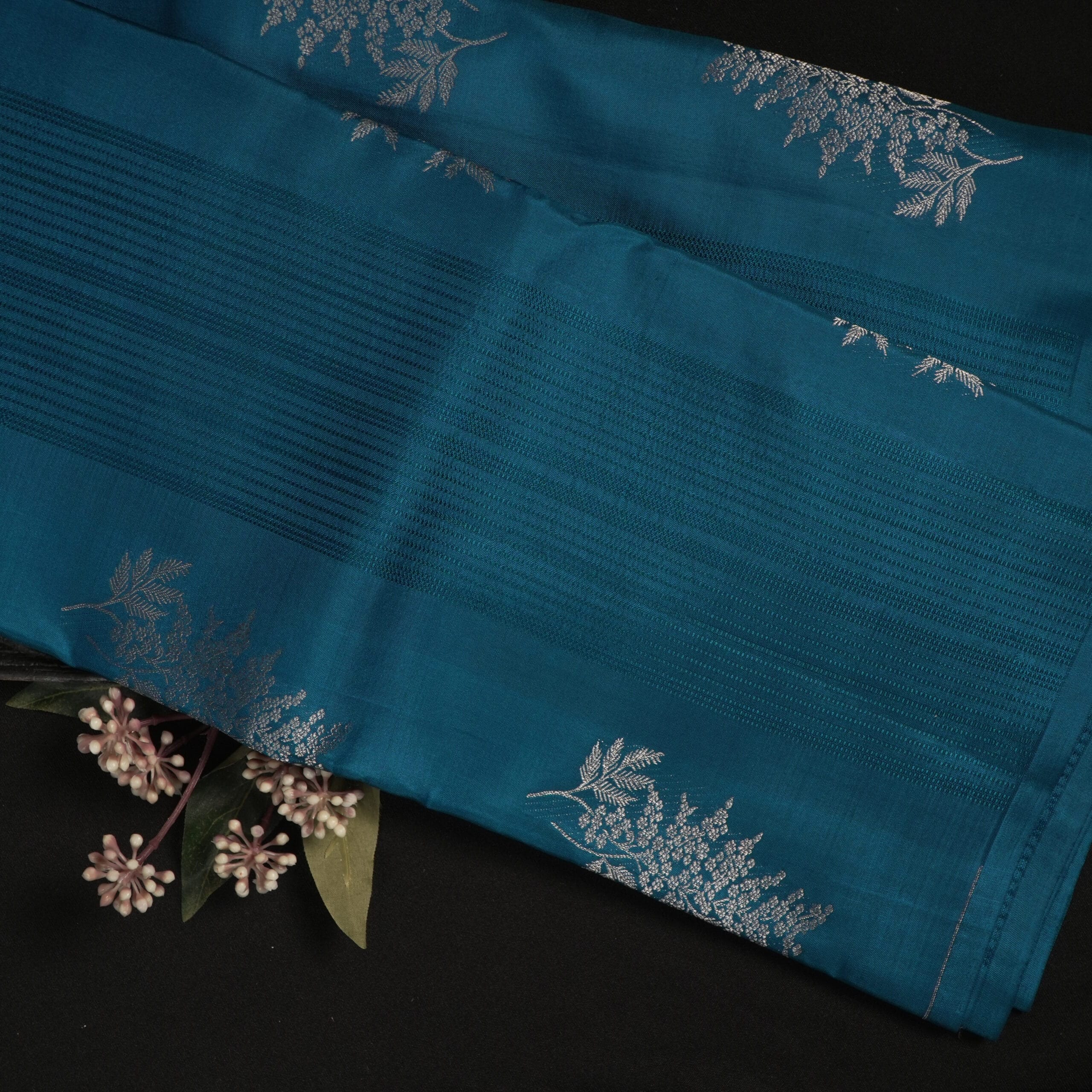 Kanchipuram Silk – Teal Blue with Silver Woven Motifs
